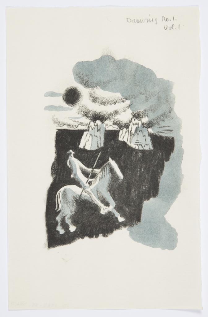 Print, Illustration for Don Quixote; Written by Miguel de Cervantes (Spanish, 1547–1616); Designed by Edward McKnight Kauffer (American, active England, 1890–1954); Printed by The Curwen Press (United Kingdom); Published by Nonesuch Press; USA; offset lithograph, hand-colored additions in brush and blue watercolor on paper; 22.9 × 14.2 cm (9 × 5 9/16 in.); Gift of Mrs. E. McKnight Kauffer; 1963-39-346-b