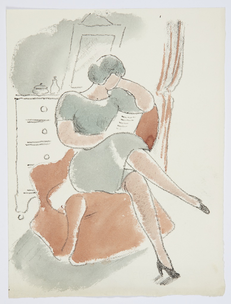 Print, Illustration for Venus Rising From the Sea; Written by Arnold Bennett (British, 1867–1931); Designed by Edward McKnight Kauffer (American, active England, 1890–1954); Printed by The Curwen Press (United Kingdom); Published by Cassell & Co.; USA; offset lithograph, hand-colored additions in brush and gray and brown watercolor on paper; 25.6 × 19.5 cm (10 1/16 × 7 11/16 in.); Gift of Mrs. E. McKnight Kauffer; 1963-39-399