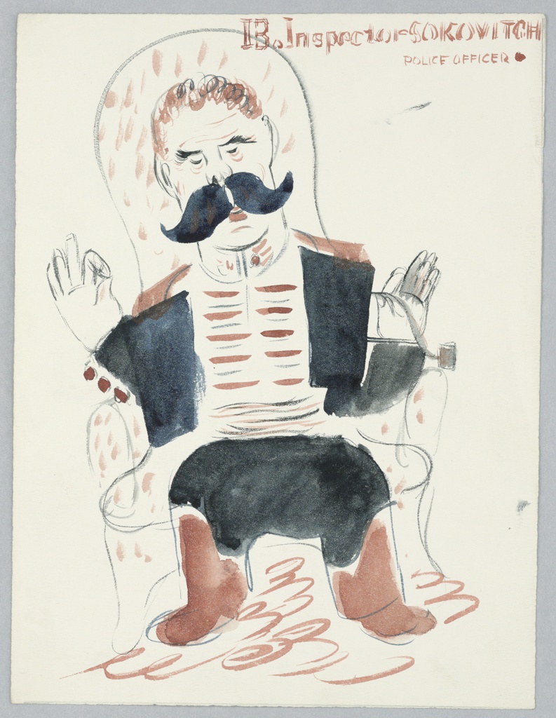 Drawing, Illustration for Benia Krik; Designed by Edward McKnight Kauffer (American, active England, 1890–1954); Written by Isaak Emmanuilovich Babel (Russian, 1894–1940); USA; brush and watercolor on paper; 28.2 × 21.3 cm (11 1/8 × 8 3/8 in.); Gift of Mrs. E. McKnight Kauffer; 1963-39-405