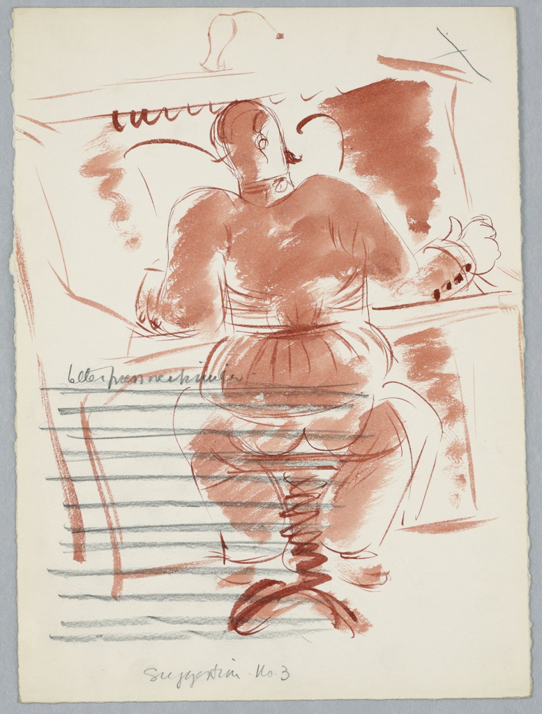 This is a Drawing. It was designed by Edward McKnight Kauffer and written by Isaak Emmanuilovich Babel. It is dated ca. 1931 and we acquired it in 1963. Its medium is graphite, brush and brown watercolor on paper. It is a part of the Drawings, Prints, and Graphic Design department.