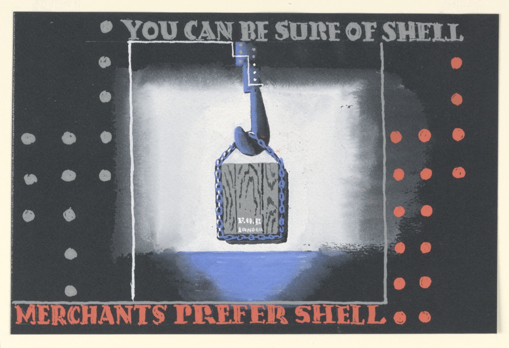 Drawing, Design for "Merchants Prefer Shell"; Designed by Edward McKnight Kauffer (American, active England, 1890–1954); Client: Shell-Mex and BP Ltd.; USA; brush and gouache on black paper; 15 × 22.7 cm (5 7/8 × 8 15/16 in.); Gift of Mrs. E. McKnight Kauffer; 1963-39-538