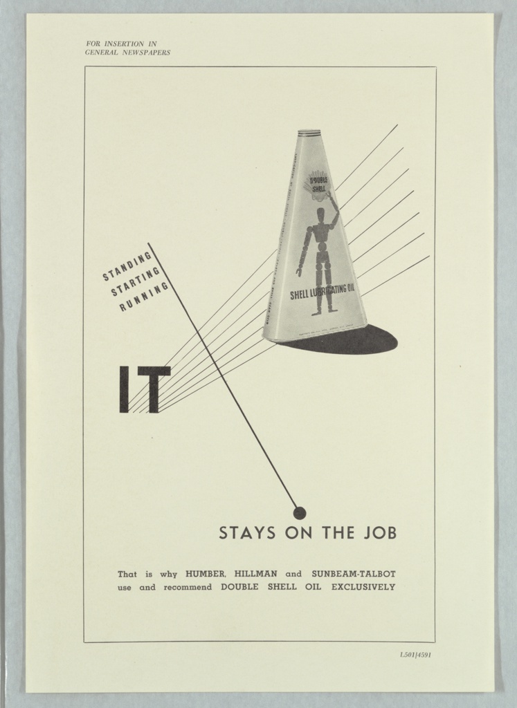 Print, It Stays on the Job; Designed by Edward McKnight Kauffer (American, active England, 1890–1954); Client: Shell-Mex and BP Ltd.; USA; offset lithograph on paper; 32.9 × 22.6 cm (12 15/16 × 8 7/8 in.); Gift of Mrs. E. McKnight Kauffer; 1963-39-583