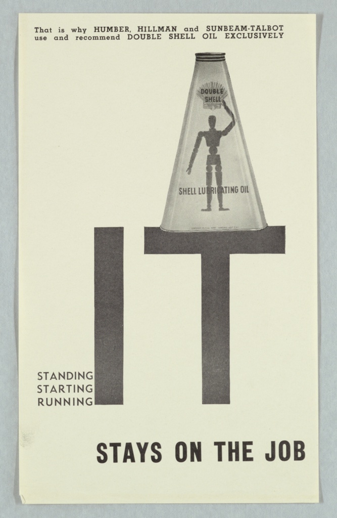 Print, It Stays on the Job; Designed by Edward McKnight Kauffer (American, active England, 1890–1954); Client: Shell-Mex and BP Ltd.; USA; offset lithograph on paper; 27.5 × 16.8 cm (10 13/16 × 6 5/8 in.); Gift of Mrs. E. McKnight Kauffer; 1963-39-586