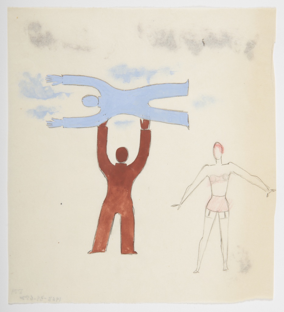 Drawing, Three Studies of Figures, Charnaux; Designed by Edward McKnight Kauffer (American, active England, 1890–1954); Client: Charnaux Patent Corset Co. Ltd.; USA; graphite, brush and brown and blue gouache on thin paper; 18 × 16.4 cm (7 1/16 × 6 7/16 in.); Gift of Mrs. E. McKnight Kauffer; 1963-39-652