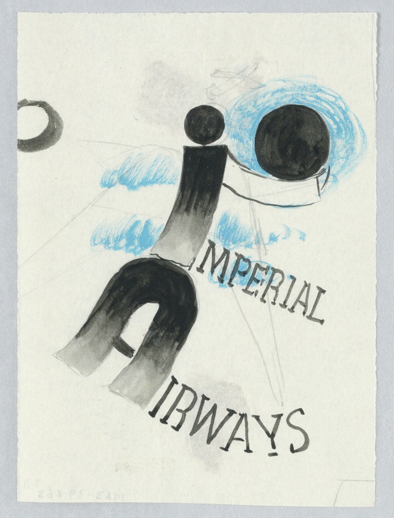This is a Drawing. It was designed by Edward McKnight Kauffer and made for (as the client) Imperial Airways Ltd.. It is dated ca. 1935 and we acquired it in 1963. Its medium is graphite, brush and black and blue watercolor on thin paper. It is a part of the Drawings, Prints, and Graphic Design department.