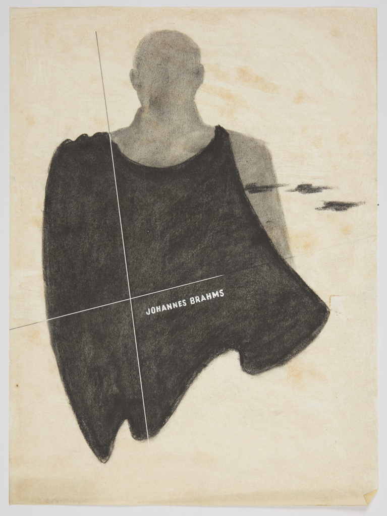 Drawing, Design for a Sheet Music Cover, Johannes Brahms; Designed by Edward McKnight Kauffer (American, active England, 1890–1954); USA; graphite, charcoal, brush and white gouache on thin paper; 33.5 × 24.6 cm (13 3/16 × 9 11/16 in.); Gift of Mrs. E. McKnight Kauffer; 1963-39-696
