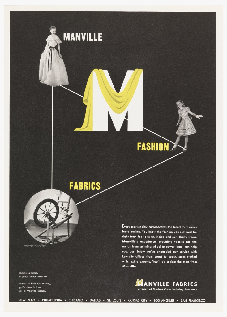 <ref name=CH>{{cite web |url=https://www-6.collection.cooperhewitt.org/objects/18448727/ |title=Print, Advertisement for Manville Fabrics |author=Cooper Hewitt, Smithsonian Design Museum |accessdate=20 December 2025 |publisher=Smithsonian Institution}}</ref>