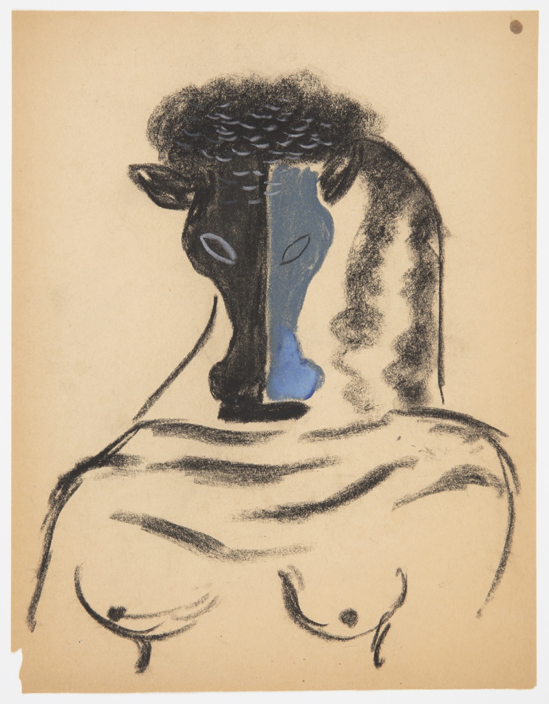 Drawing, Study of a Minotaur; Designed by Edward McKnight Kauffer (American, active England, 1890–1954); USA; charcoal, blue and white pastel on paper; 31.2 × 24.2 cm (12 5/16 × 9 1/2 in.); Gift of Mrs. E. McKnight Kauffer; 1963-39-786