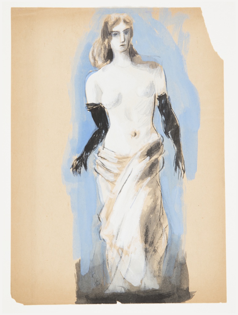 Drawing, Study of a Semi-Draped Nude with Black Gloves; Designed by Edward McKnight Kauffer (American, active England, 1890–1954); USA; brush and blue, black, and white watercolor on thin paper; 29.4 × 21.2 cm (11 9/16 × 8 3/8 in.); Gift of Mrs. E. McKnight Kauffer; 1963-39-879