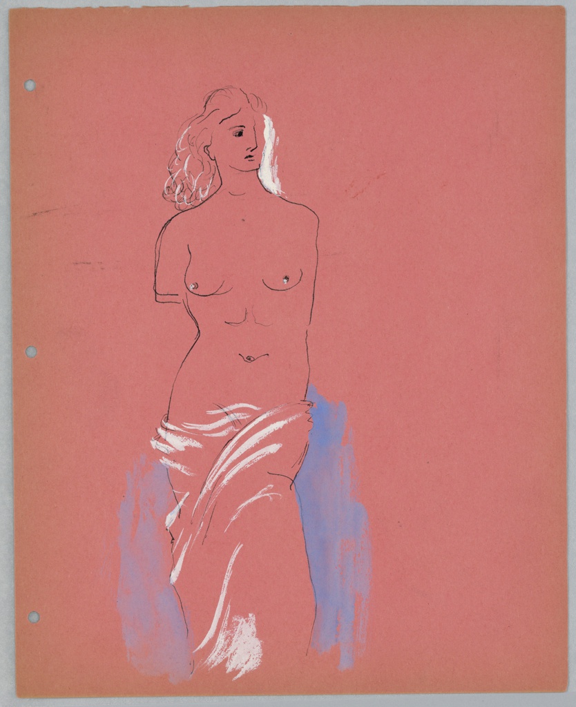 Drawing, Study of the Venus de Milo; Designed by Edward McKnight Kauffer (American, active England, 1890–1954); USA; pen and black ink, brush and blue and white watercolor on pink paper; 27.9 × 22.4 cm (11 × 8 13/16 in.); Gift of Mrs. E. McKnight Kauffer; 1963-39-880