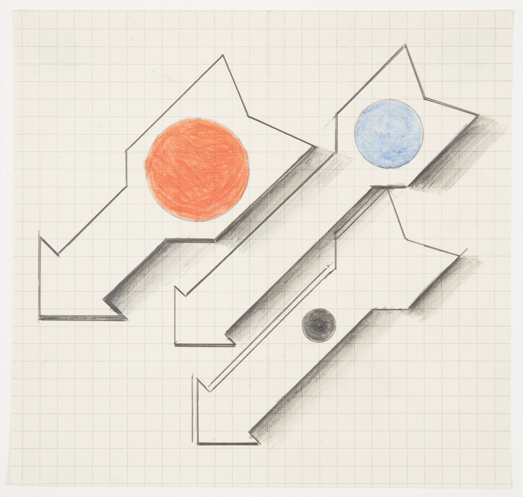 Drawing, Study for a Motif with Three Arrows; Designed by Edward McKnight Kauffer (American, active England, 1890–1954); USA; graphite, red, blue, and black crayon on graph paper; 17.2 × 18 cm (6 3/4 × 7 1/16 in.); Gift of Mrs. E. McKnight Kauffer; 1963-39-892