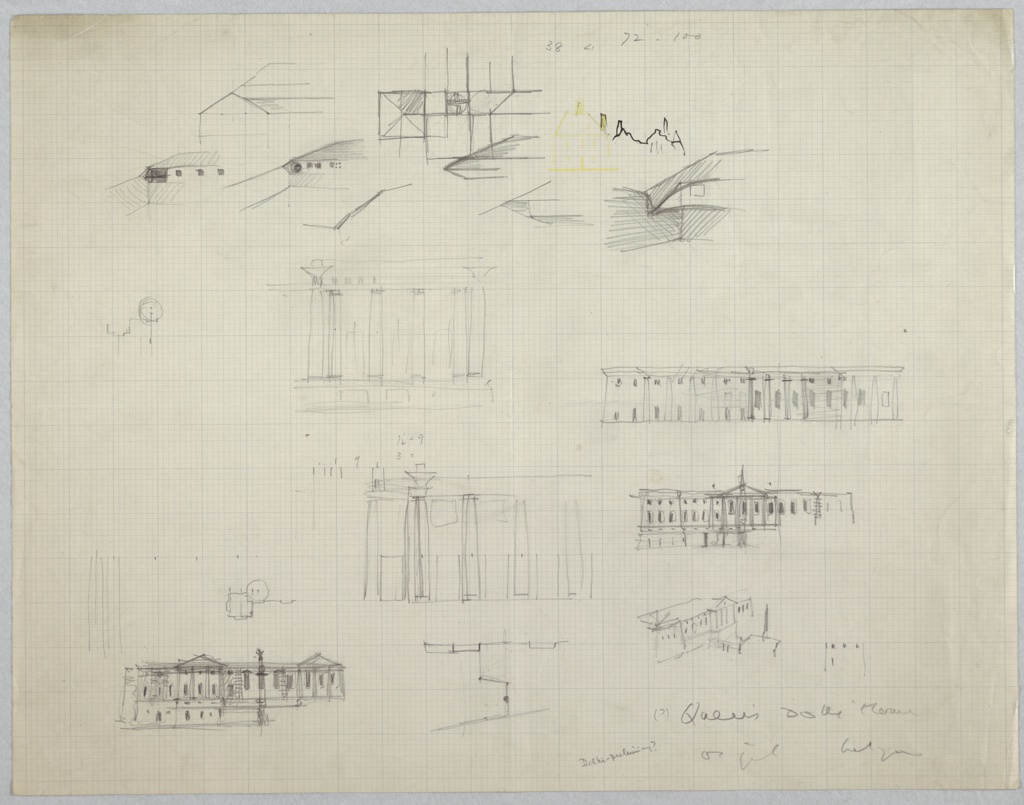 Drawing, Design for a Building; England; graphite, pen and black ink, yellow color pencil on graph paper; 45.4 × 57.9 cm (17 7/8 × 22 13/16 in.); 1963-90-14