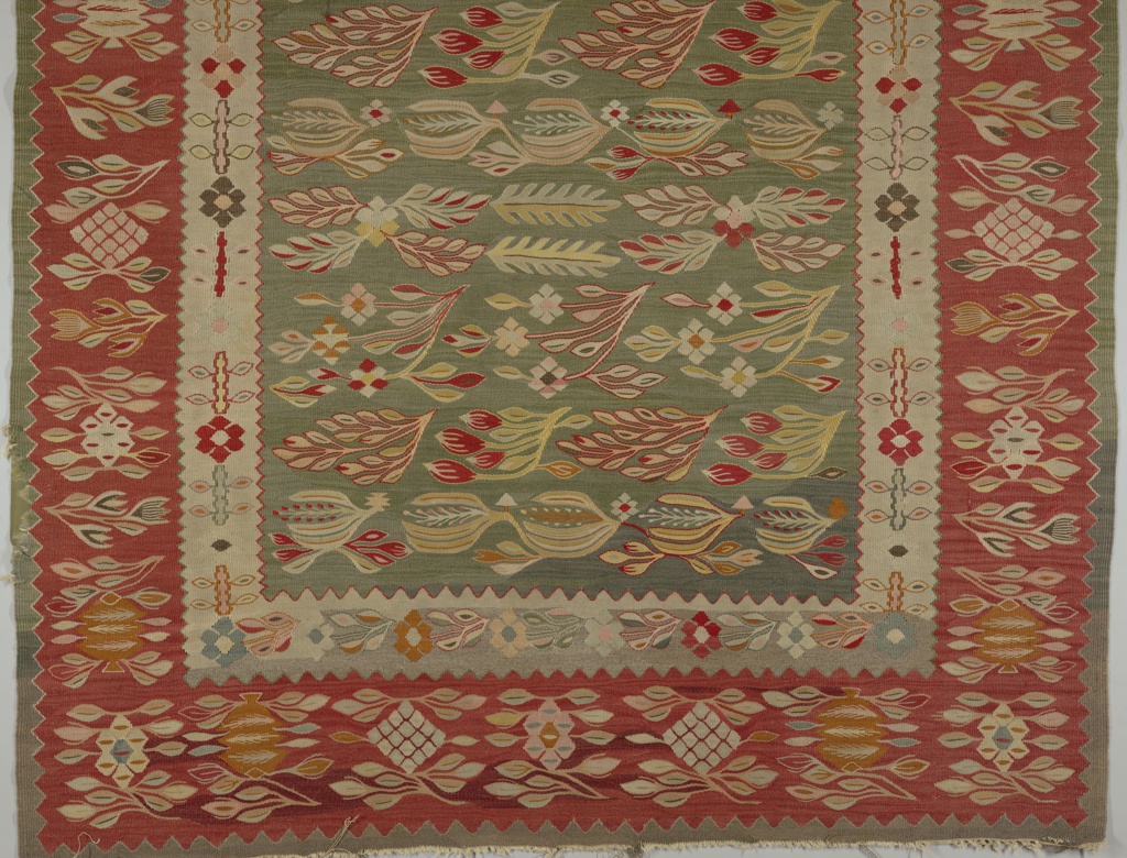 This is a Rug. It was designed by Märta Måås-Fjetterström and woven by Märta Måås-Fjetterström. It is dated 1937 and we acquired it in 1964. Its medium is wool and its technique is plain weave with discontinuous wefts (tapestry). It is a part of the Textiles department.