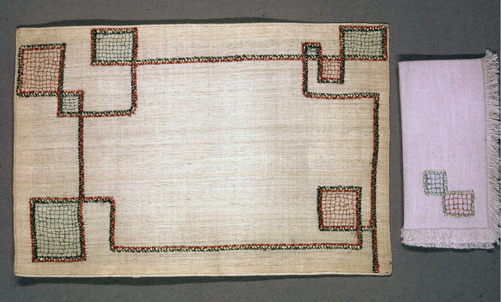 This is a Place mat and napkin. It was designed by Mariska Karasz and embroidered by Mariska Karasz. It is dated 1952 and we acquired it in 1964. Its medium is placemat: palm fiber/rattan foundation embroidered with viscose rayon and cellulose acetate butyrate laminated aluminum yarn; napkin: acetate, viscose rayon, and cotton blend foundation embroidered with viscose rayon, cellulose acetate butyrate laminated and its technique is embroidered. It is a part of the Textiles department.