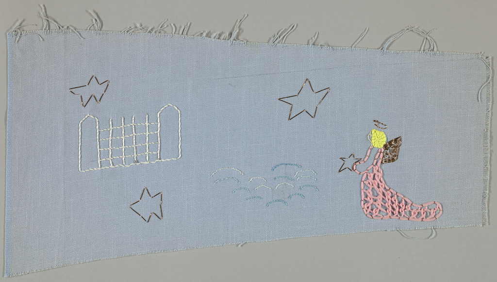 This is a Fragment. It was student of Mariska Karasz. It is dated 1950–60 and we acquired it in 1964. Its medium is cotton, straw, metallic thread and its technique is embroidered. It is a part of the Textiles department.