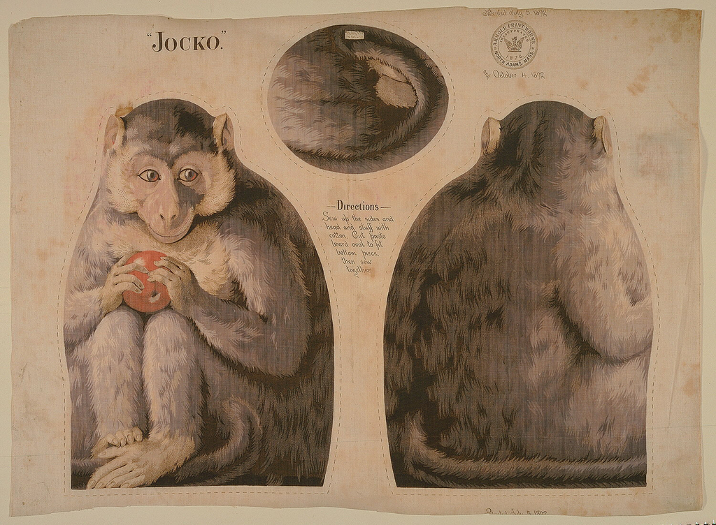 Jocko is just one of a patented group of cloth animals first manufactured by the Arnold Print Works of North Adams, Massachusetts in 1892. With sewing instructions printed directly on the fabric, the animals were typically made from three pieces that were cut, stitched and stuffed with cotton. An optional piece of cardboard added in the bottom would make the animal stand upright. Arnold Print Works took out a full-page advertisement in the October 25, 1894 issue of The Youth’s Companion that showed Jocko along with other domestic animals like Tabby Cat, the dogs Bow-Wow, Tatters and Floss, Bunny, and Rooster.