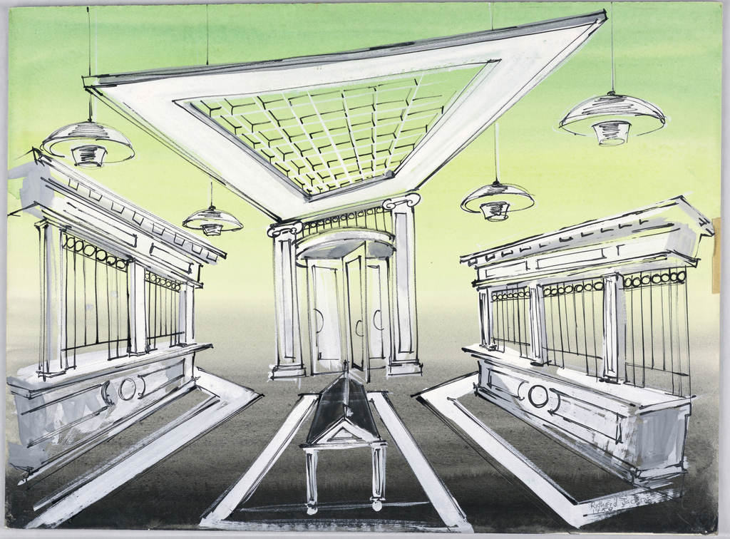 Drawing, Background Sketch for Television Commercial; Designed by Richard Jackson; USA; brush and watercolor, white gouache, pen and black ink on illustration board; 37.3 × 51 cm (14 11/16 × 20 1/16 in.); Gift of Richard Jackson; 1965-22-1