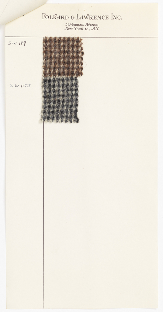 This is a Sample sheets. It was imported by: Folkard & Lawrence, Inc.. It is dated 1940–1960 and we acquired it in 1966. Its medium is wool, paper. It is a part of the Textiles department.
