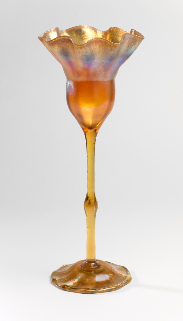 This is a Vase. It was manufactured by Tiffany Studios and the design director was Louis Comfort Tiffany. It is dated ca. 1900 and we acquired it in 1966. Its medium is favrile glass. It is a part of the Product Design and Decorative Arts department.
