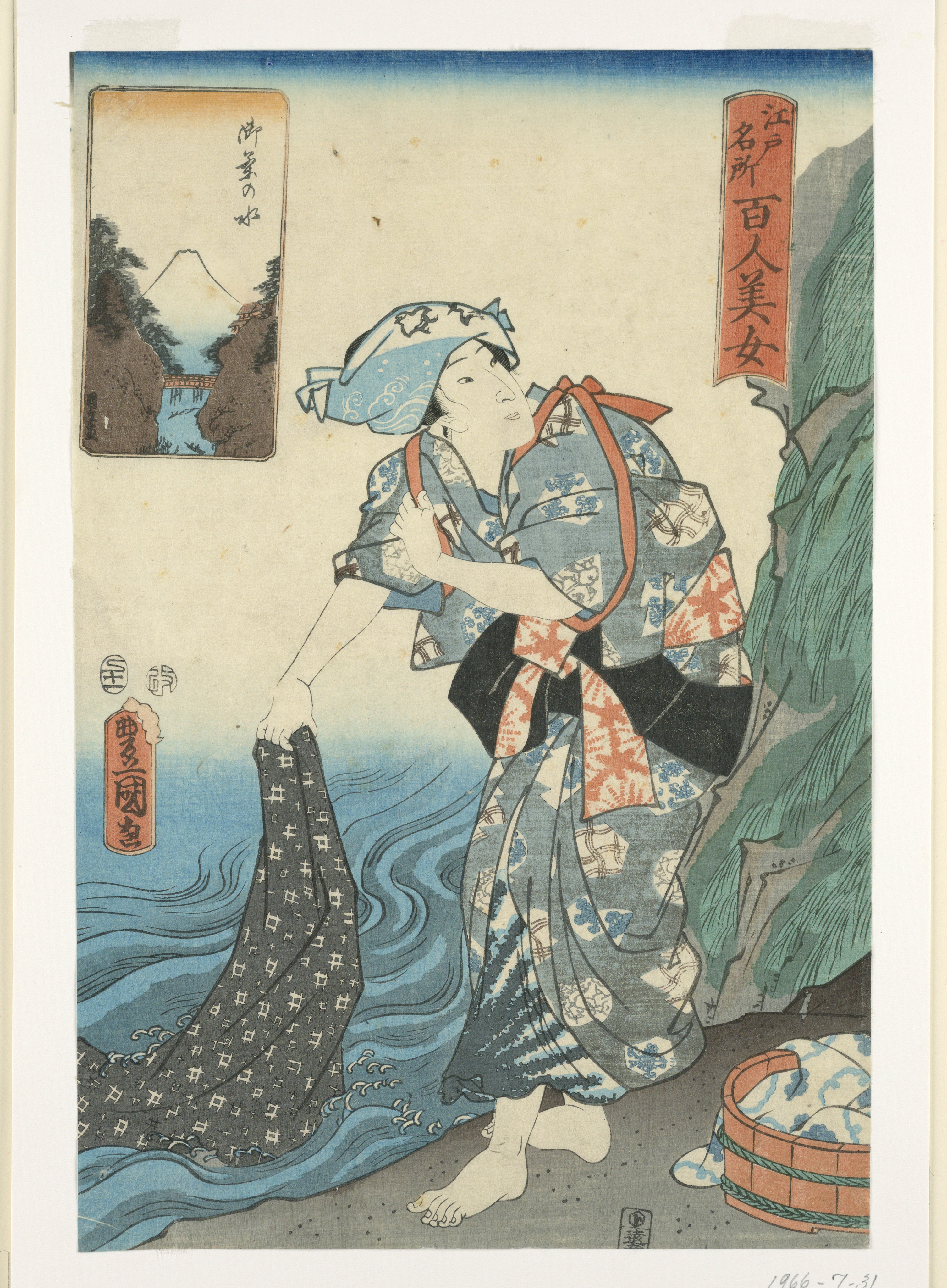 Print, Woman washing fabric in a stream; Print Maker: Utagawa Kunisada; Japan; woodblock print in colored ink on paper; Gift of Mr. and Mrs. Maxime Hermanos; 1966-7-31