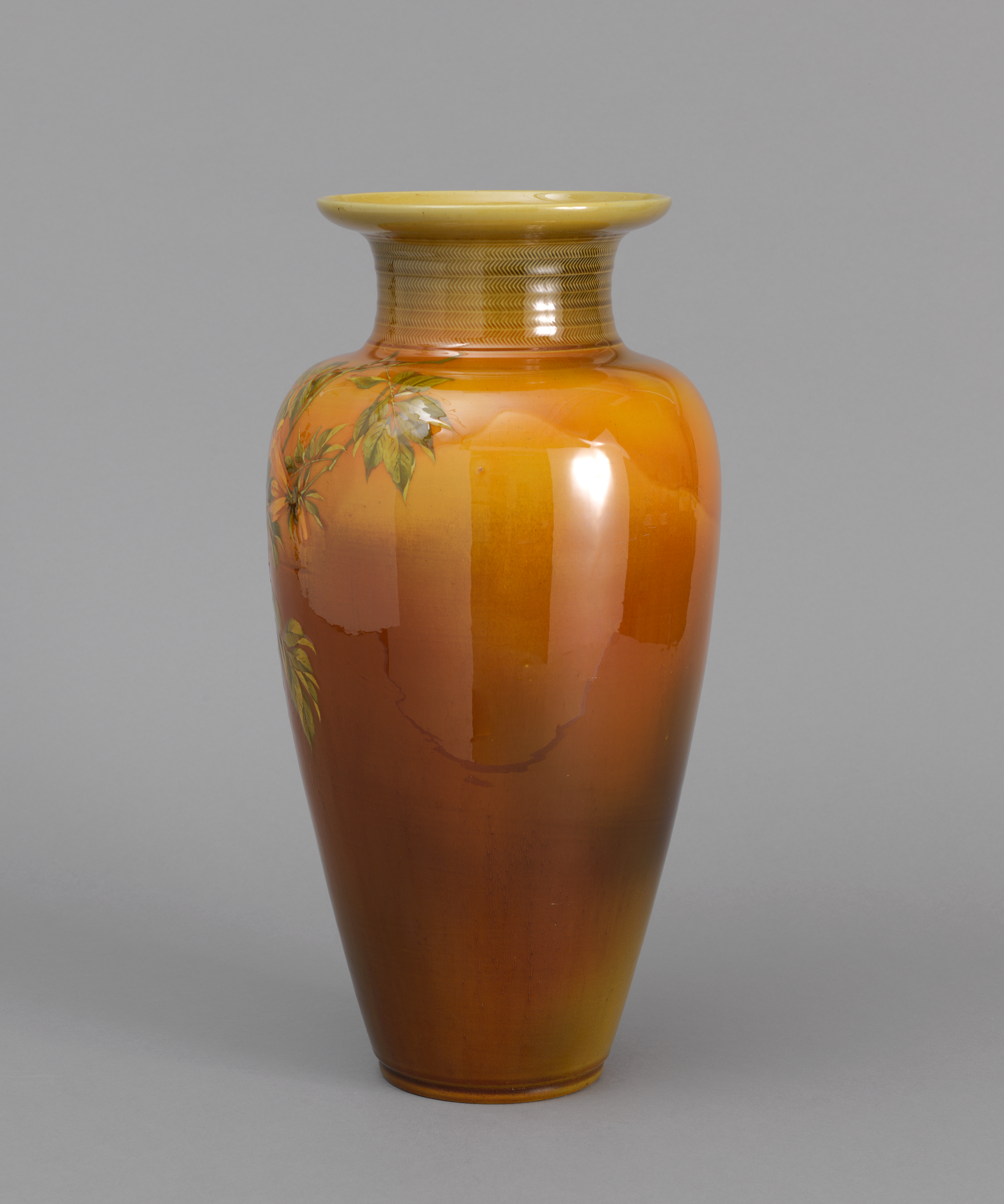 Although often associated with the simplicity of the Arts and Crafts movement, Rookwood Pottery produced richly painted, decorative wares. The company’s style was inspired by European and Japanese aesthetics, and foreign decorators were often hired. Shirayamadani, a Japanese expatriate, produced this vase for Rookwood, combining a more graphic Japanese aesthetic with Rookwood’s naturalistic motifs and color palette.