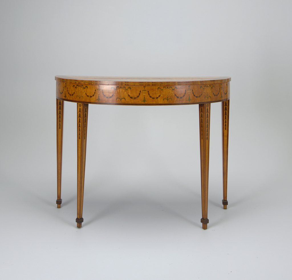 A collector of English furniture once asked me if I recognized who might have made a chest of drawers he had purchased. It had beautifully executed inlays and was in an early neo-classical style that appeared to say it was made in London. In fact, the inlays looked like the work of the firm of cabinetmakers Mayhew and Ince who produced very fine furniture there from about 1759-1800, much of which featured sophisticated inlays in the style popularized by architect Robert Adam, with whom they worked. However, there was more whimsy in the style of the inlays on the chest. These included some vine-like trees that seemed to sway, which I came to call the “drunken tree” motif. I set about looking for the tree motif again and found it and other inlays re-appearing on a the work of a former employee of Mayhew and Ince, named William Moore often called “of Dublin”. Identification of Moore’s work is primarily based on a signed commode made for the Duke of Portland while the latter was in Dublin in 1782, after Moore’s return from London. In fact, Moore’s fine inlay work had shown promise in Ireland where he also attended a school of ornamental design before leaving for London. The Portland commode had several distinctive inlay motifs and an unusual method of construction using pine under the marquetry that are found in other pieces of furniture now attributed to Moore. The inlays with their whimsy are his designs: not only my drunken trees, which appeared on other pieces including some commodes at the Metropolitan Museum by him, but other whimsical inlays that appear on Cooper-Hewitt's tables. These include urns sitting on upside-down bellflowers, and a motif that is a cross between a honeysuckle and a rather puffy and loopy anthemion that has little to do with the palm trees on which the ancients based this decorative motif. Both of these motifs are visible in the friezes of these tables. In fact the frieze on these tables is the same design as the frieze of both the Duke of Portland’s commode and another at the Victoria and Albert Museum. The inlay of the Cooper-Hewitt table tops has asymmetrical flowing ribbon-ties amidst trailing flowers and shamrocks that look as if the wind had blown them, but they are anchored by a fan shape that may reflect the decoration of what was probably a mirror above. I really enjoy that these pieces have such a breezy interpretation of what is a formal style.