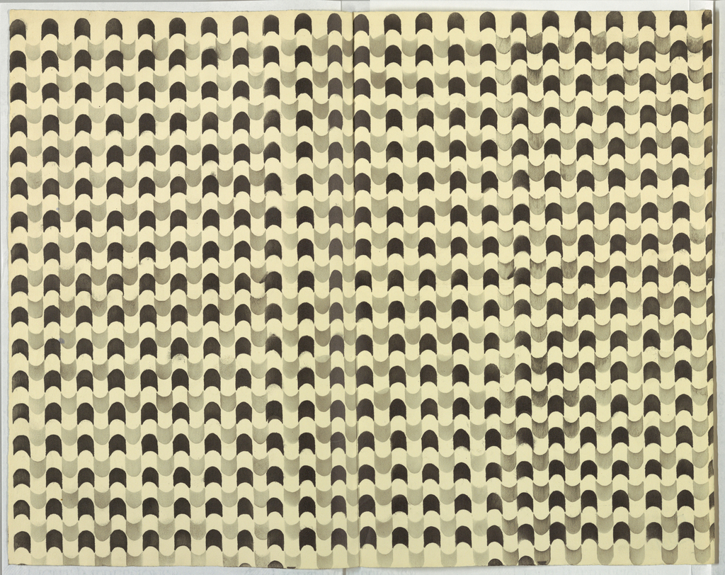 This is a Decorated paper. It is dated 1940–60 and we acquired it in 1968. Its medium is black & grey watercolor support: cream laid paper. It is a part of the Drawings, Prints, and Graphic Design department.