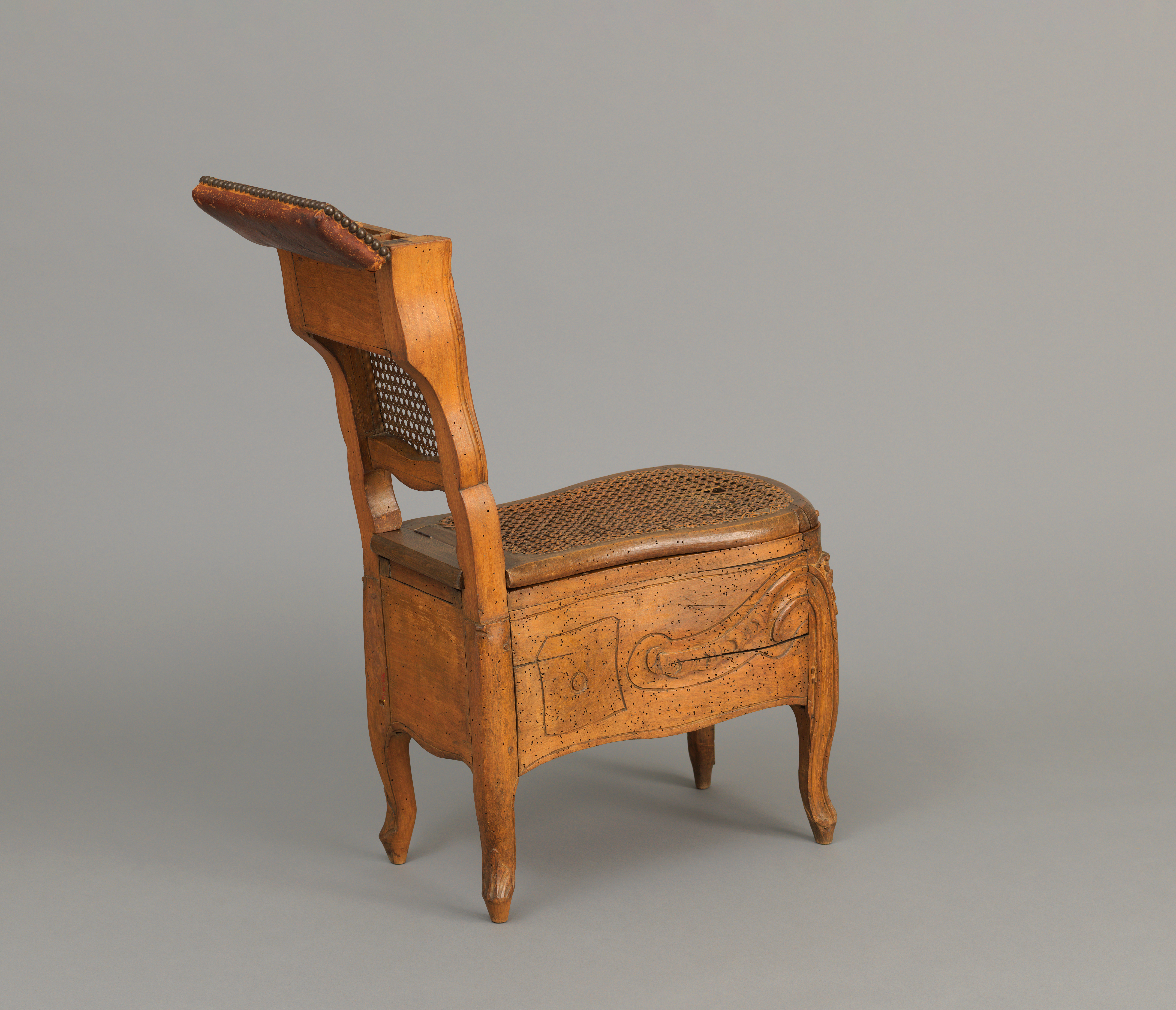 Practicality was not overlooked in the development of specialized seat furniture in mid-eighteenth-century France. This chaise bidet à nécessaires was designed to be straddled; the leather-covered top of the caned chairback serves as an armrest; and hinges open compartments for toiletries.