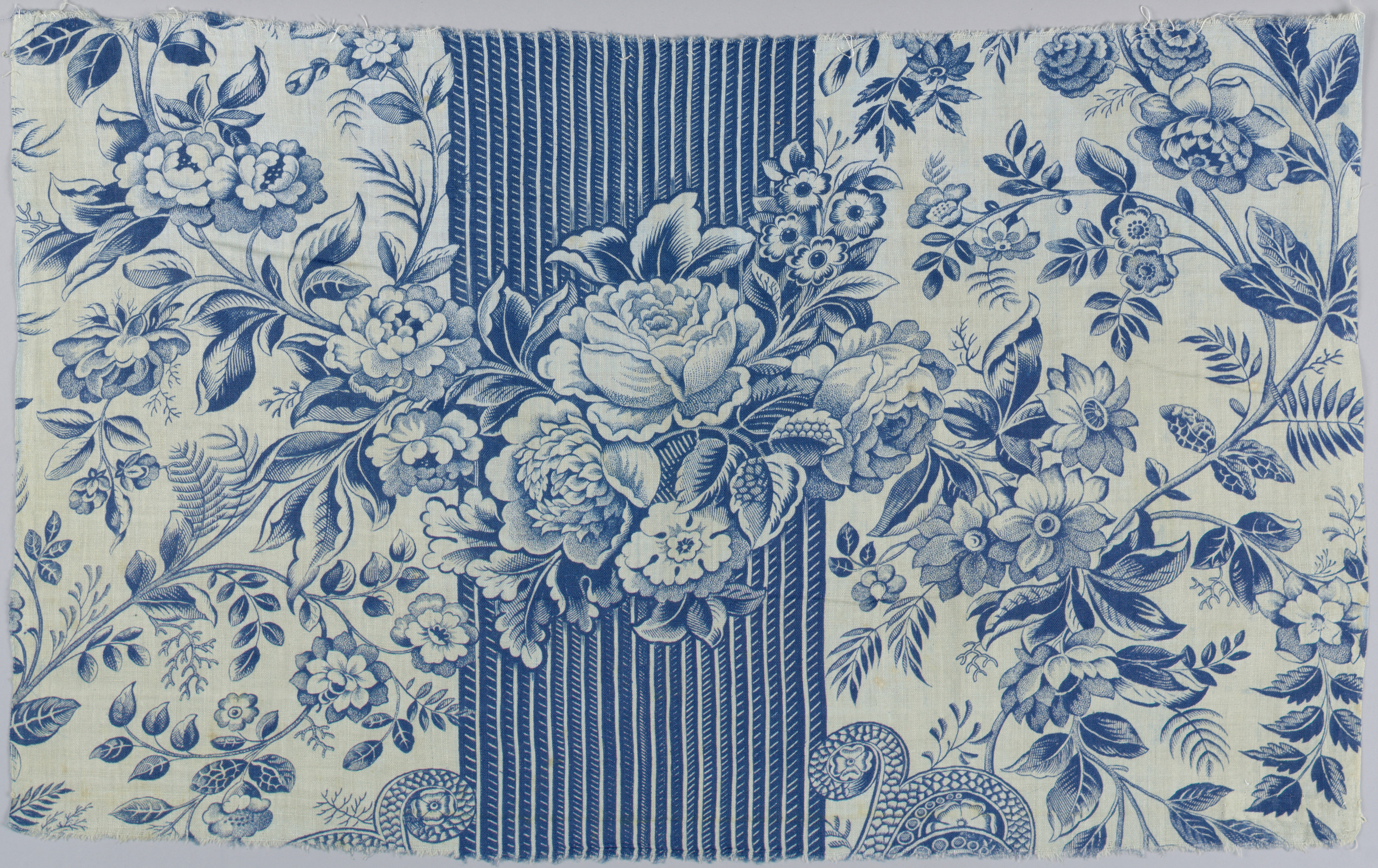 This is a Textile. It is dated early 19th century and we acquired it in 1968. Its medium is cotton and its technique is roller printed (in blue) on plain weave. It is a part of the Textiles department.