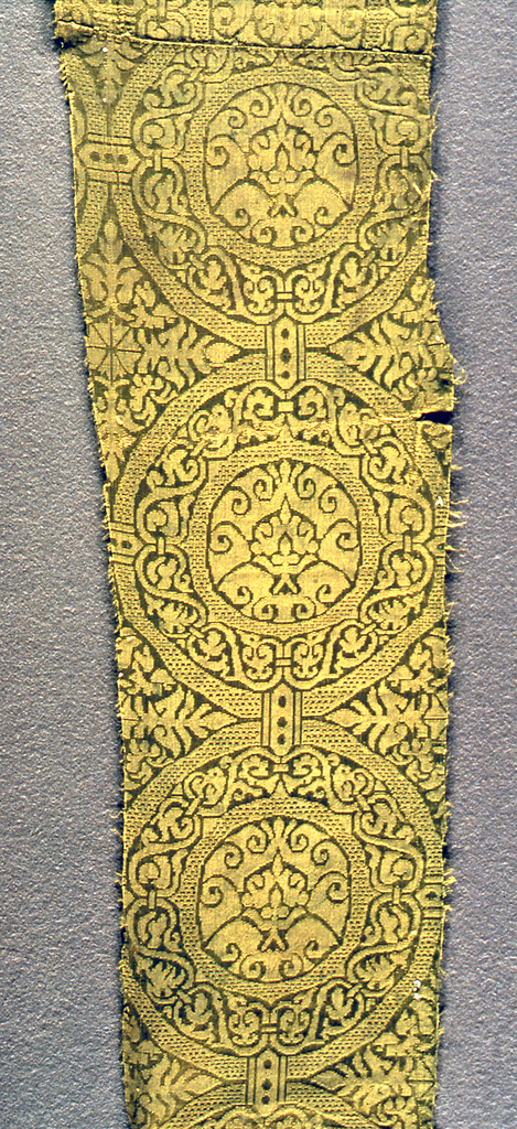 This is a Fragment. It is dated 16th century and we acquired it in 1968. Its medium is silk and its technique is 5-harness satin damask. It is a part of the Textiles department.