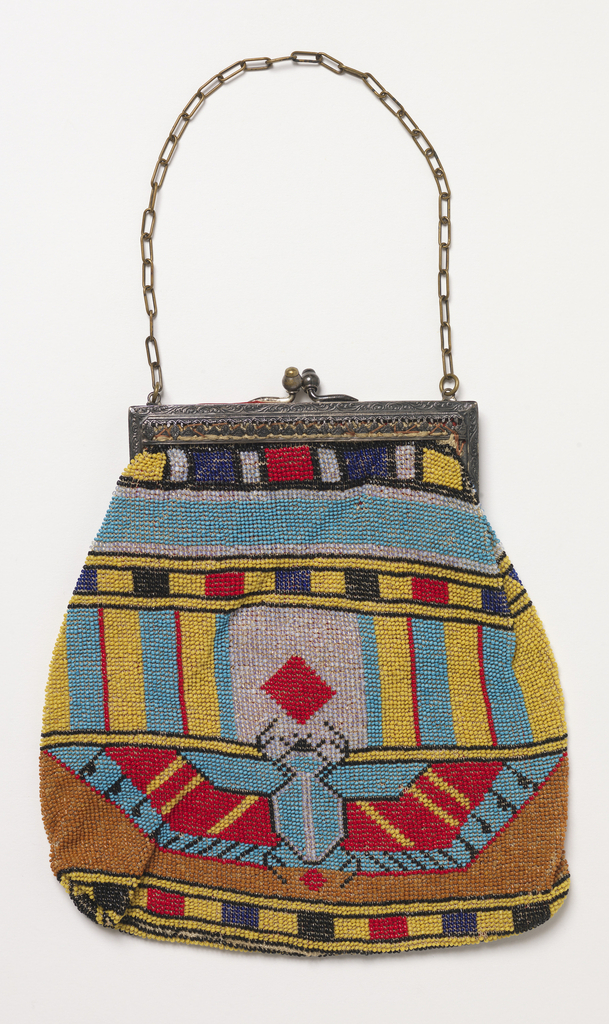 This is a Purse. It is dated 1910–30 and we acquired it in 1968. Its medium is glass beads, cotton, metal and its technique is knitted in crossed stockinette stitch with beads. It is a part of the Textiles department.