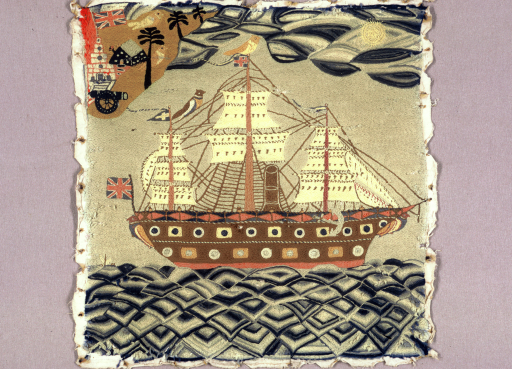 This is a Embroidered picture. It is dated early 19th century and we acquired it in 1968. Its medium is wool on cotton and its technique is split and flat surface embroidery stitches. It is a part of the Textiles department.