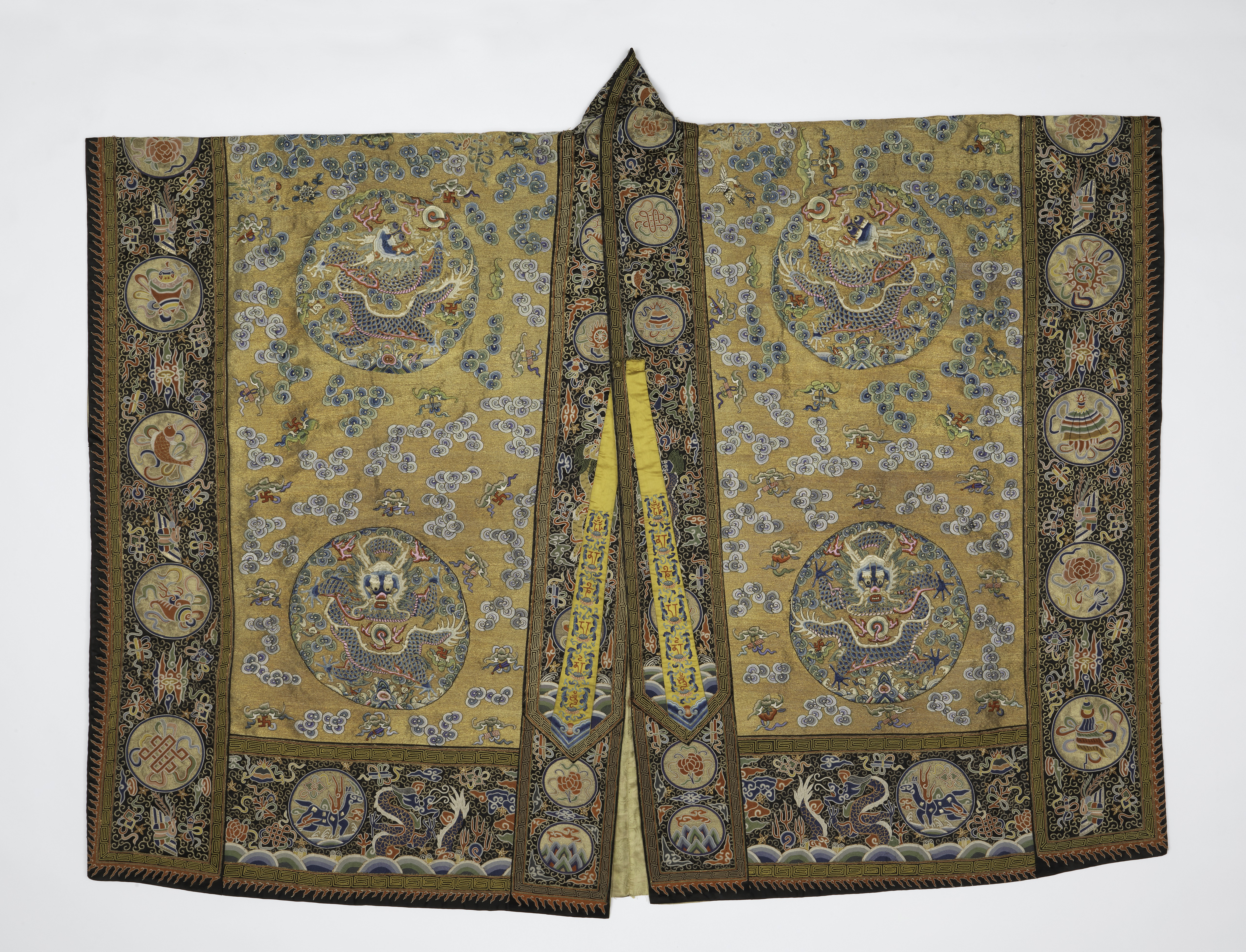 The visual complexity of the "robe of descent" (jiang yi絳衣) worn by the highest-ranking Daoist priests demonstrates how priests used symbols and words to control their environment. The complex symbols were believed to transform the wearer into a ritual participant who communicated between human and spirit worlds. The priest faced the altar to conduct rites, so the robe back typically contains the design’s focal point: Above a central pagoda surrounded by twenty-eight Lunar Mansions (the colored discs), are three small circles representing gates and on either side, roundels containing symbols for sun (represented as a three-legged pheasant) and moon (represented as a rabbit pounding a mortar). This robe features large roundels with five-clawed dragons chasing magic pearls: four on the front and two on the back, surrounded by bats, swastikas, and cranes. The robe’s bottom bands have dragons rising out of the sea, medallions containing carps, turtles, snake, qilins, and other auspicious symbols. Smaller roundels around the side borders contain the Eight Auspicious Buddhist symbols, and Taoist immortal symbols. The robe fastens with two yellow silk tabbed ribbons embroidered with Sanskrit writing. Religious garments often feature heavy use of metallic threads, here the ground is laid down with gold couched threads that set off the embroidered clouds and bats, and thicker gold strips are laid down around the borders.