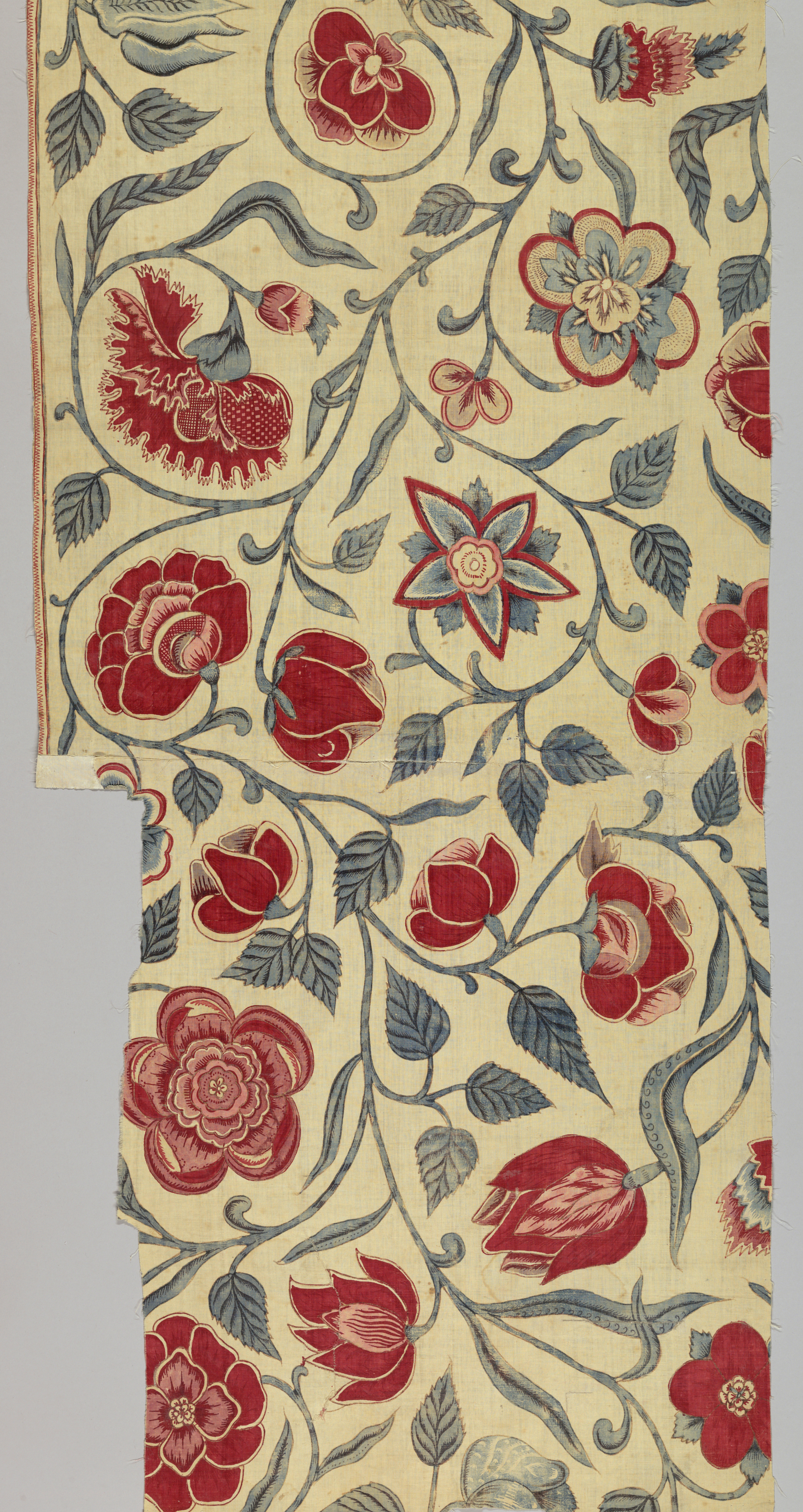 This is a Textile. It is dated 1700–1750 and we acquired it in 1968. Its medium is plain weave cotton and its technique is mordant and resist painted; immersion dyed (chintz). It is a part of the Textiles department.