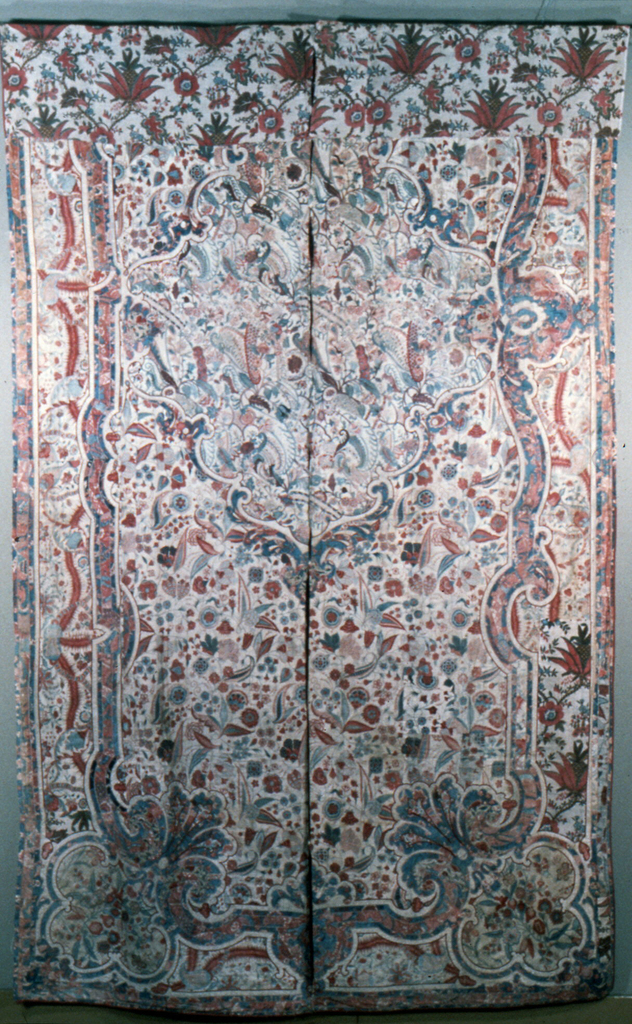 This is a Curtains. It is dated 1725–50 and we acquired it in 1968. Its medium is cotton, linen and its technique is patchwork of different plain weave fabrics which have been mordant and resist painted and dyed. It is a part of the Textiles department.