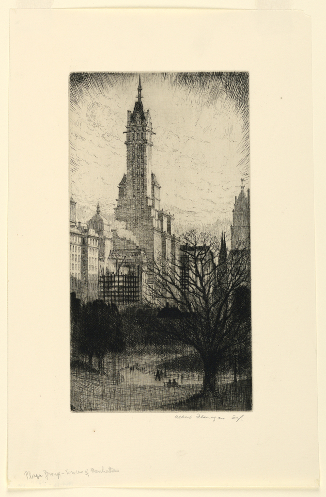 Print, Plaza Group, Towers of Manhattan; Albert Flanagan (American, 1884–1969); USA; etching in black ink on paper; Gift of Mrs. Albert E. Flanagan; 1969-116-27