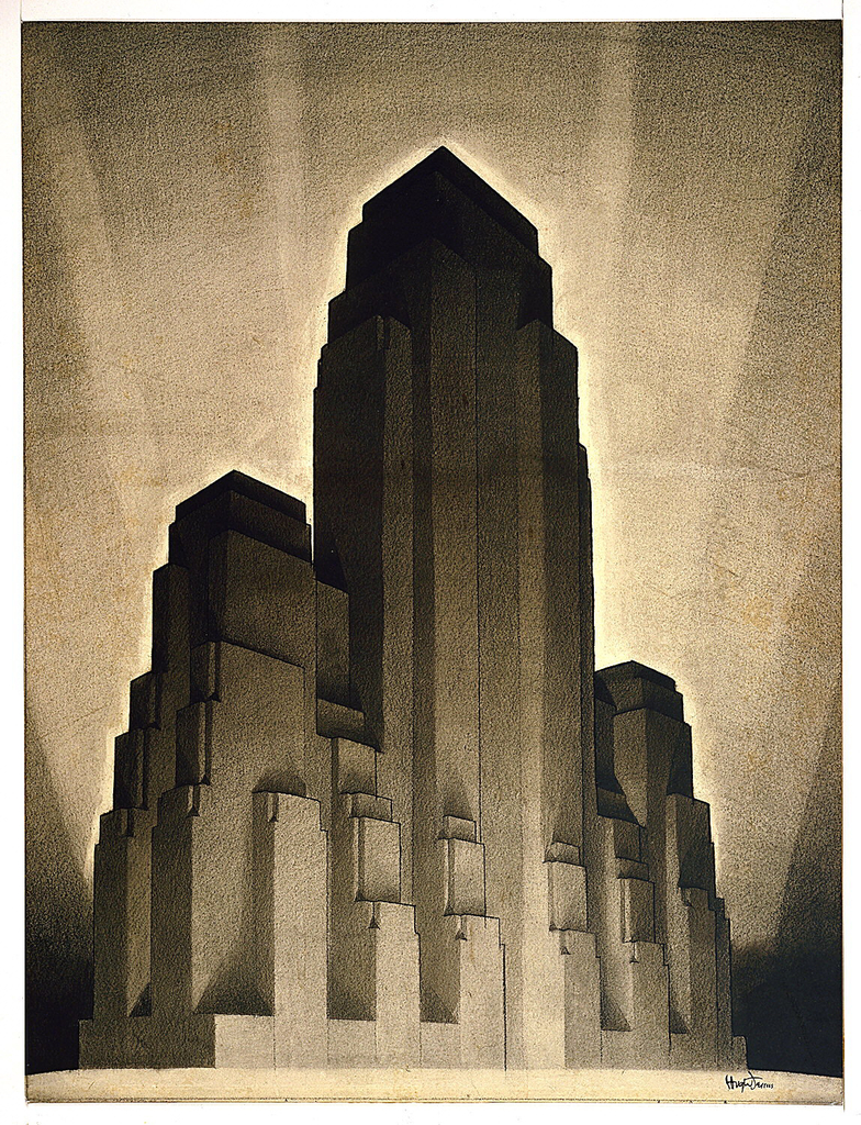 Signed in pen and black ink, lower right: Hugh Ferriss