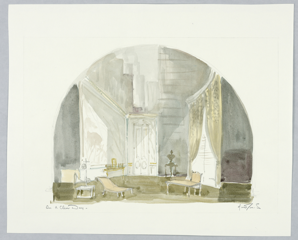 Drawing, Stage Design: On a Clear Day You Can See Forever; USA; brush and watercolor, graphite on paper; H x W: 21 × 26.5 cm (8 1/4 × 10 7/16 in.); Gift of Oliver Smith; 1969-171-26