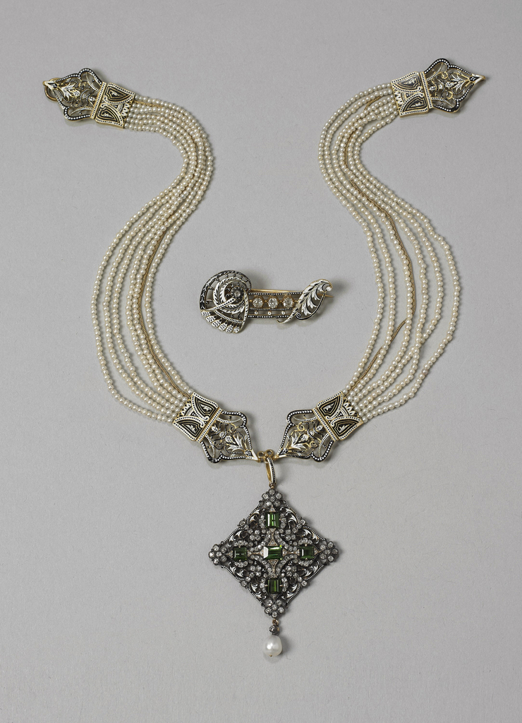 Necklace (England); Made by Carlo Giuliano (Italian, 1831 - 1895); gold, enamel, diamonds, pearls, peridots; Overall: 24 x 6 cm (9 7/16 x 2 3/8 in.); Museum purchase through gift of Anonymous Donor, Annie Schermerhorn Kane, and various donors; 1969-40-127-a/c
