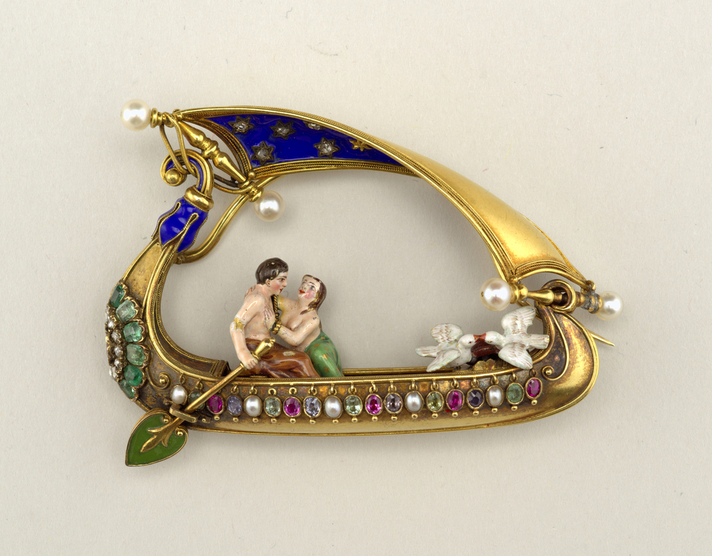 Lovers in a Boat Brooch; Made by Carlo Giuliano (Italian, 1831 - 1895); England; gold, enamel, diamonds, sapphires, emeralds, rubies, pearls; H x W x D: 7 x 5.2 x 1 cm (2 3/4 x 2 1/16 x 3/8 in.); Museum purchase through gift of Anonymous Donor, Annie Schermerhorn Kane, and various donors; 1969-40-162