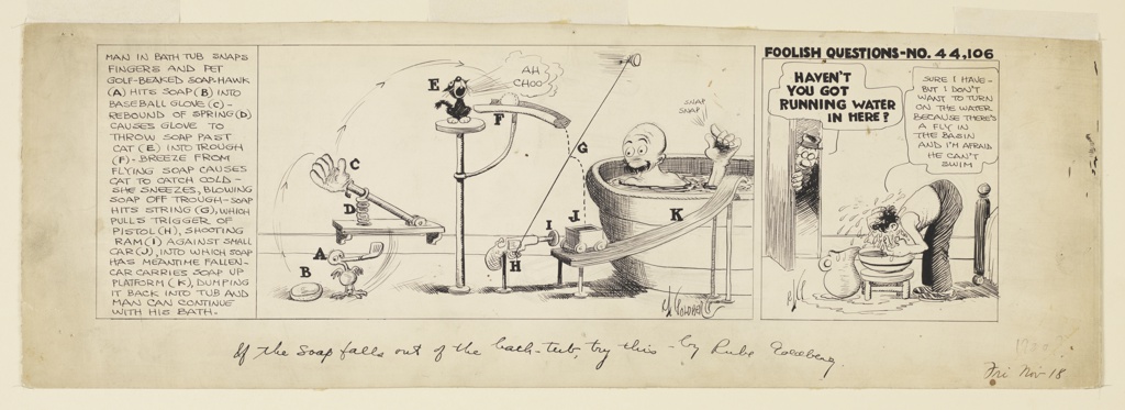 Inscribed in pen and black ink, below: If the soap falls out of the bath-tub, try this – by Rube Goldberg.; lower right corner: Fri Nov 18