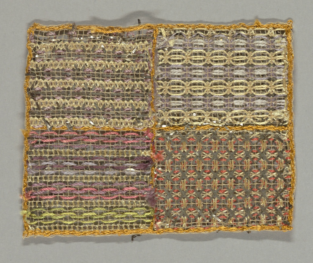 This is a Samples. It is dated 19th–late 20th century and we acquired it in 1969. Its medium is silk, metal and its technique is needlework on knotted net. It is a part of the Textiles department.