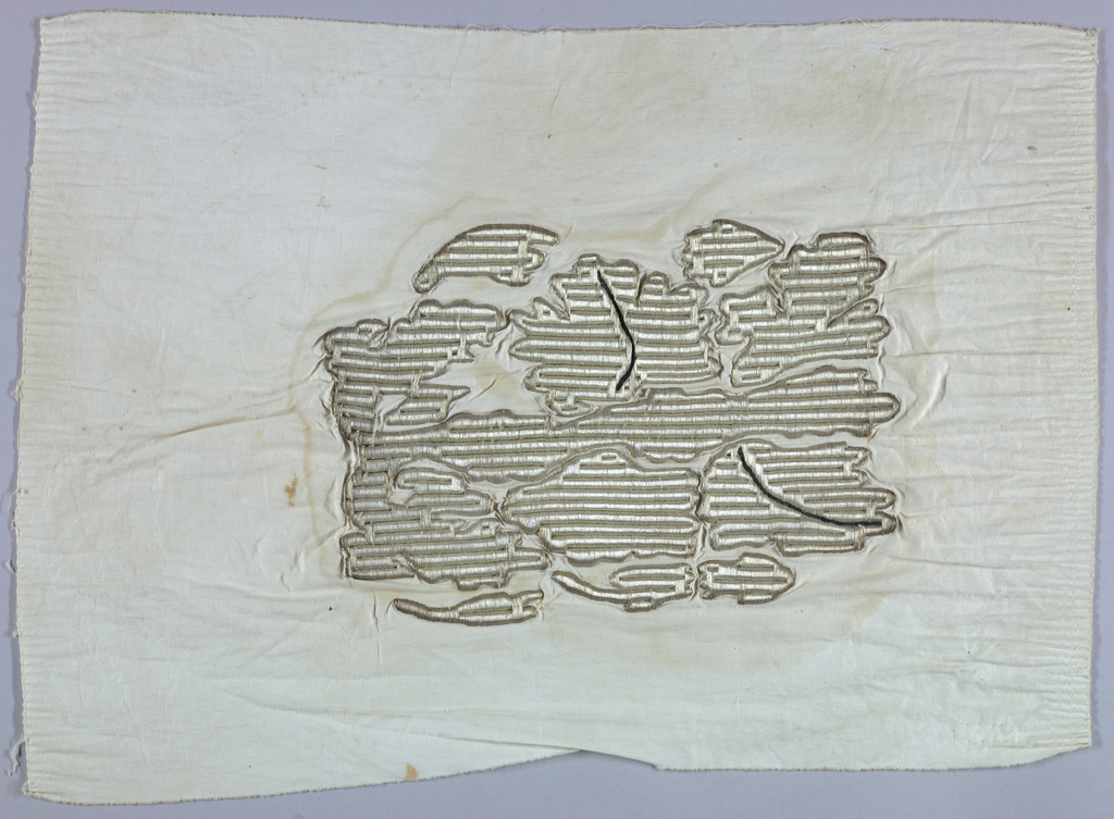 This is a Sleeve fragment. It is dated early 20th century and we acquired it in 1969. Its medium is cotton, metal-wrapped silk and silk and its technique is plain weave foundation; embroidery in relief over cotton cards; metal thread on front interlocks with cotton thread on the back at each turn; two lines of chain stitch. It is a part of the Textiles department.