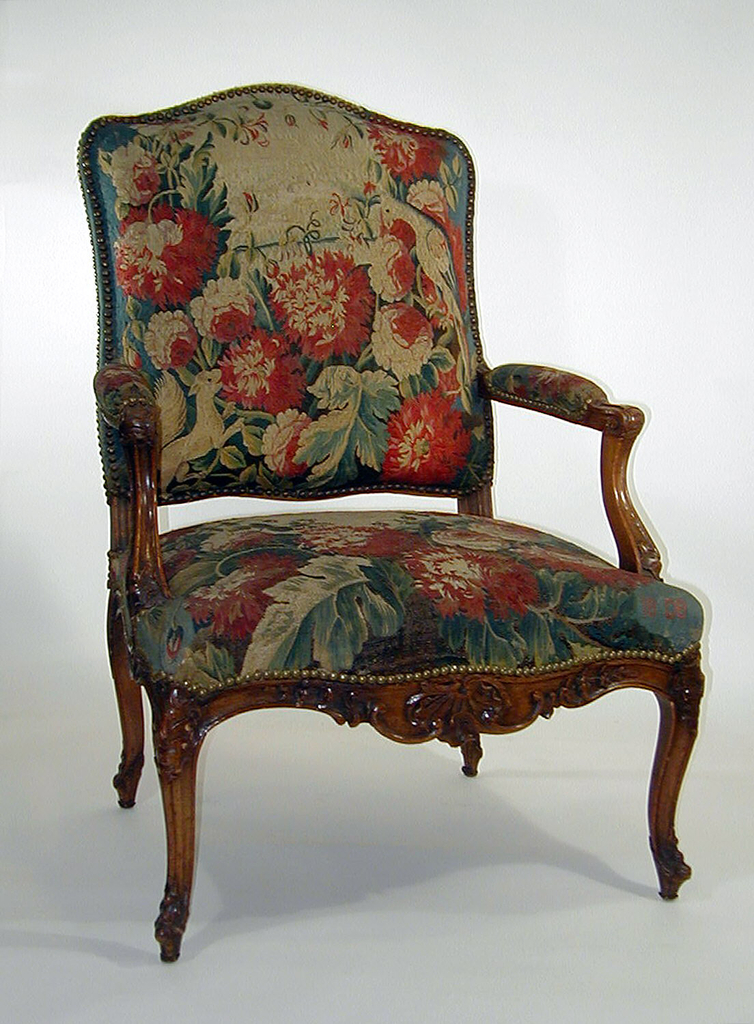 This is a Armchair. It is dated 18th century and we acquired it in 1970. Its medium is wood, metal, tapestry. It is a part of the Product Design and Decorative Arts department.