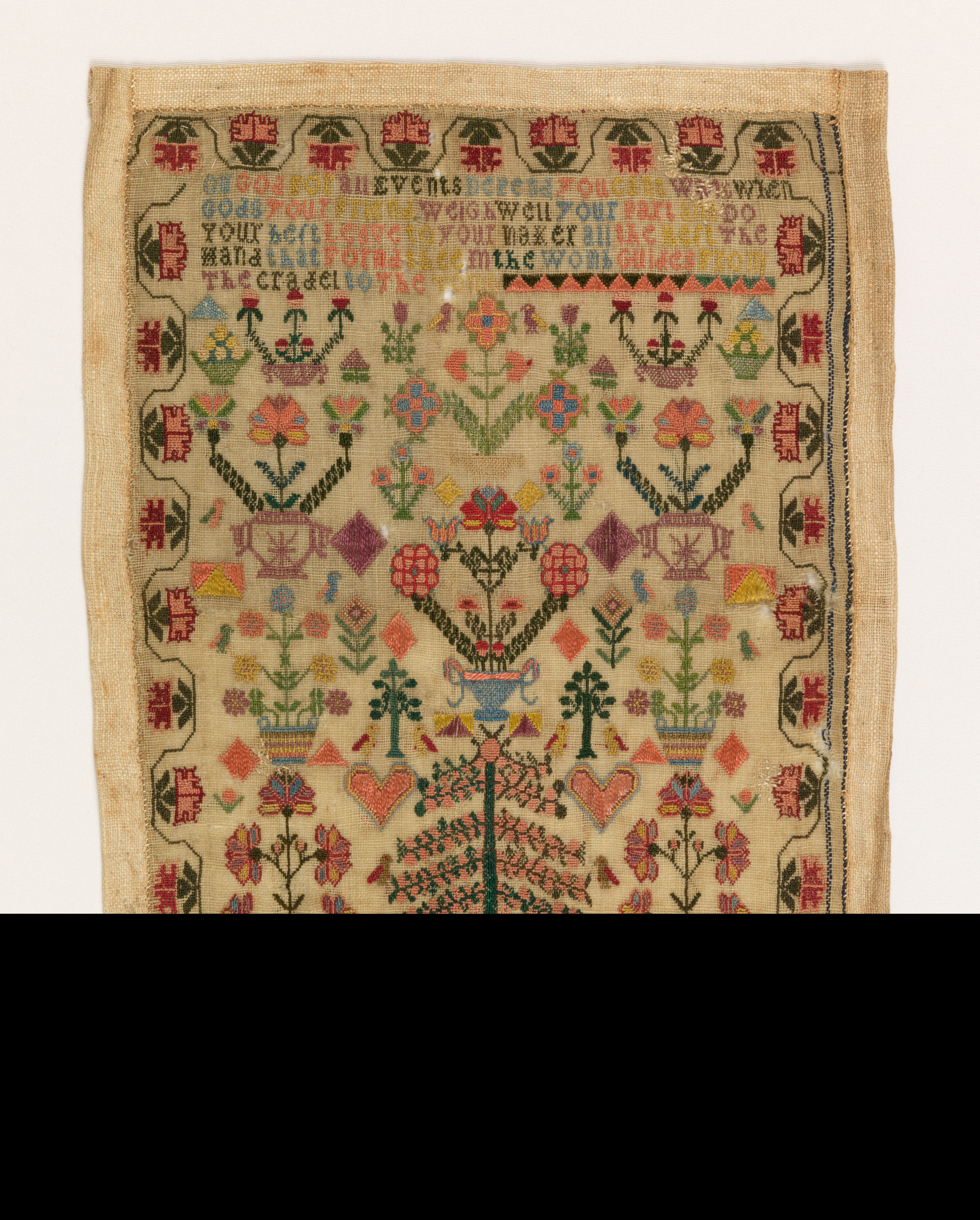 This is a Sampler. It is dated late 18th–early 19th century and we acquired it in 1970. Its medium is silk embroidery on linen foundation and its technique is embroidered on plain weave. It is a part of the Textiles department.