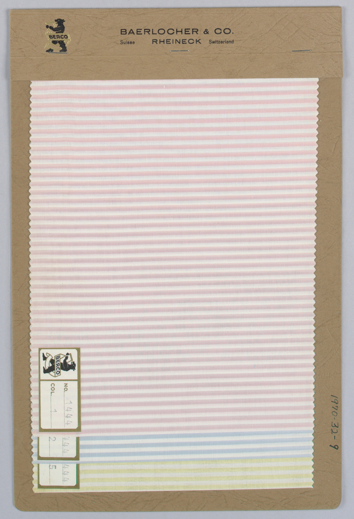 This is a Samples. It was manufactured by Baerlocher & Company. It is dated 1940–1970 and we acquired it in 1970. Its medium is cotton and its technique is woven. It is a part of the Textiles department.
