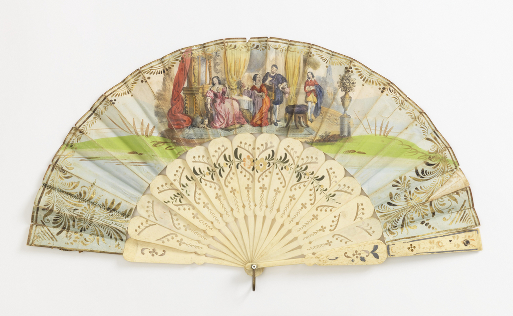 This is a Pleated fan. It is dated late 19th century and we acquired it in 1970. Its medium is printed and hand-colored paper leaf, drilled and painted bone sticks with metallic foil, mirror on one guard, mother-of-pearl washer at rivet, gilt metal bail. It is a part of the Textiles department.
