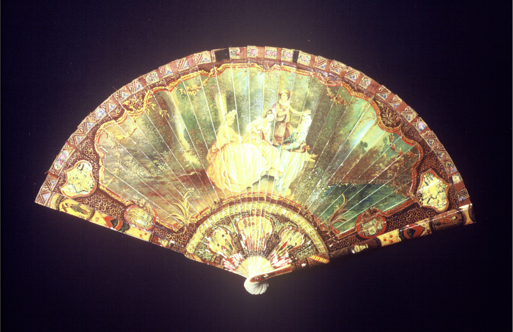 This is a Brisé fan. It is dated late 19th century and we acquired it in 1970. Its medium is painted bone sticks, silk ribbon, rivet set with a stone. It is a part of the Textiles department.