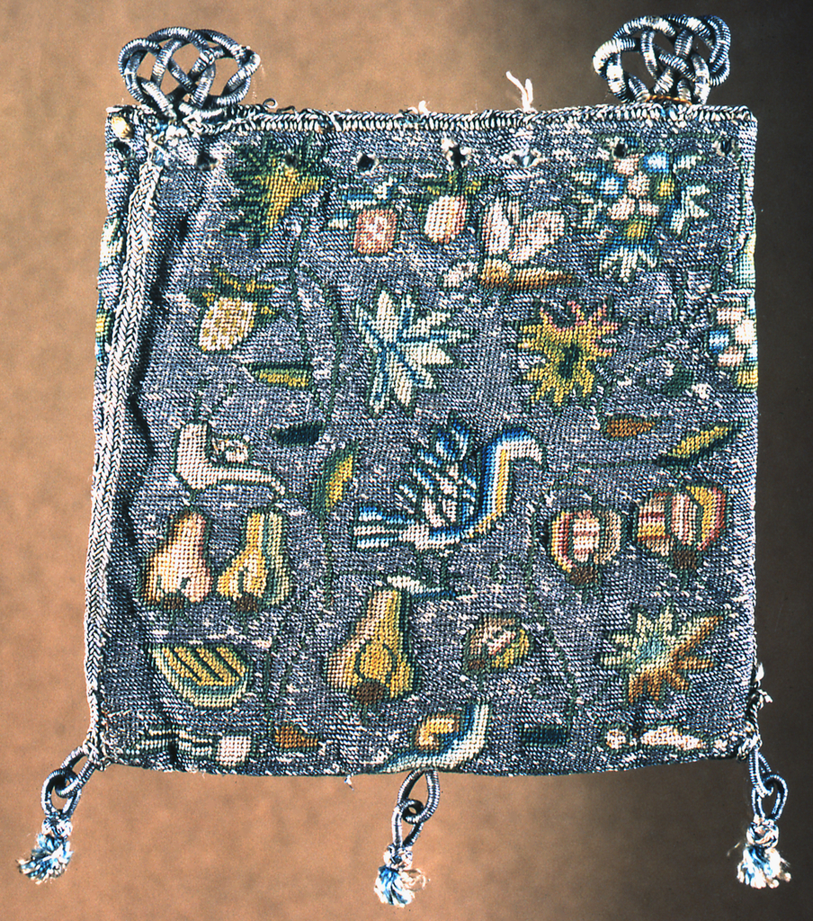 This is a Bag. It is dated ca. 1600 and we acquired it in 1971. Its medium is silk, silver-wrapped silk thread, linen and its technique is embroidery with brick and plaited braid stitch on linen plain weave foundation. It is a part of the Textiles department.