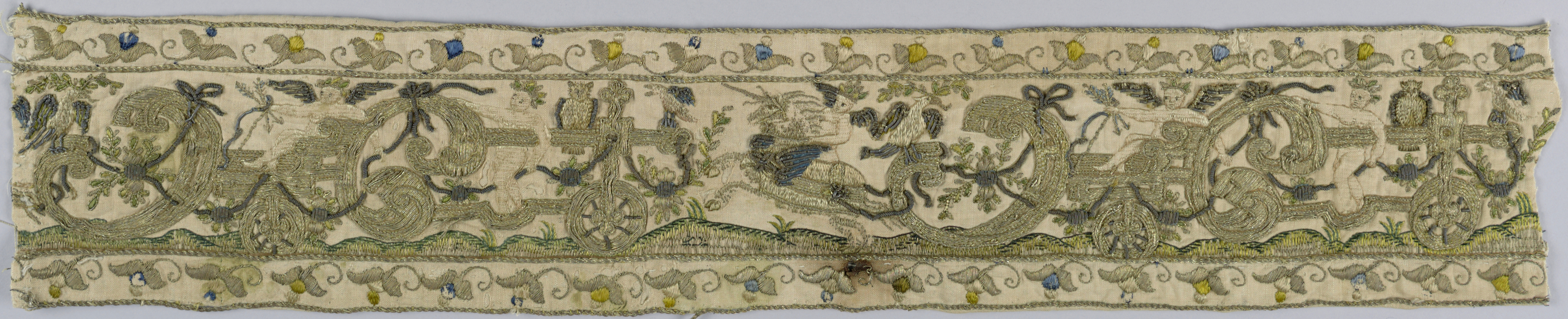 This is a Border. It is dated 17th century and we acquired it in 1971. Its medium is linen, silk, metallic thread and its technique is embroidered. It is a part of the Textiles department.